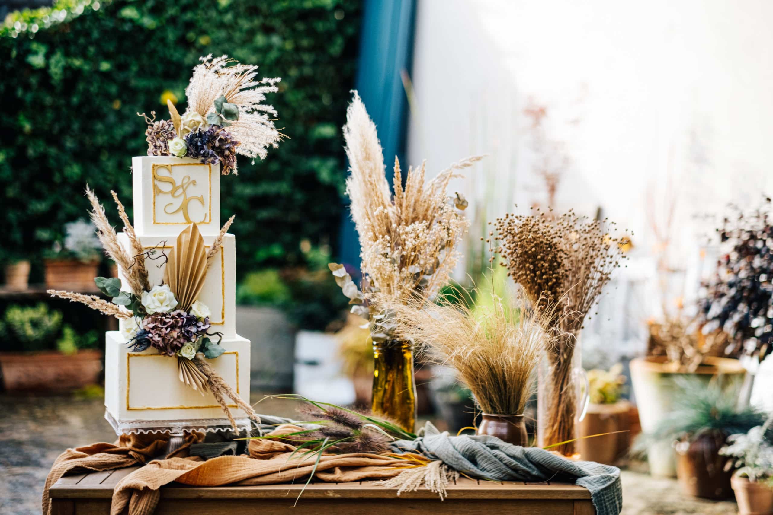 On peut partir sur des fleurs et plantes naturelles pour un gâteau très romantique, ou opter pour des fleurs séchées, qui donneront un effet bohème.